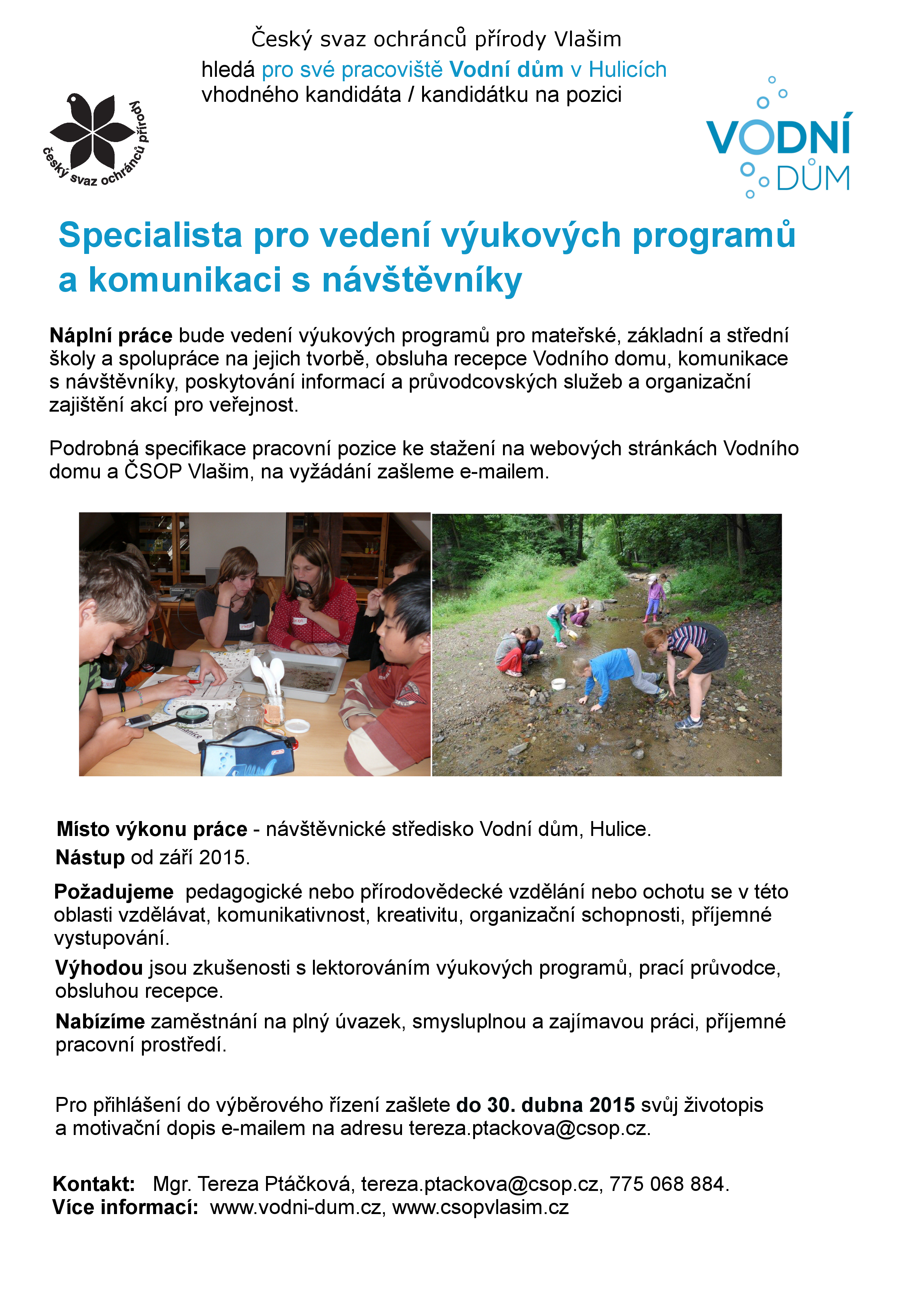 Požadujeme pedagogické nebo přírodovědecké vzdělání nebo ochotu se v této oblasti vzdělávat, komunikativnost, kreativitu, organizační schopnosti, příjemné vystupování.