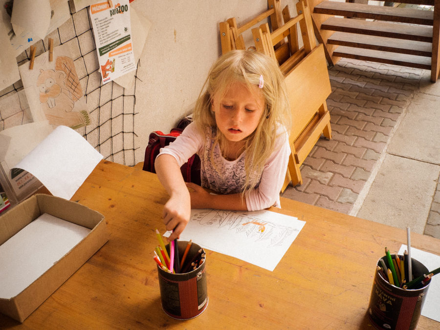 K soutěži ve vlašimské paraZoo jsme se dostali náhodou. V místě prodeje vstupenek byla vystavena plyšová vydra a Natálka ji nahlas obdivovala. Mladá prodavačka ji nabídla, že když namaluje obrázek zvířete ze zoo, může vydru vyhrát. Natálka se do kresby vrhla s akčním temperamentem a k tomu stálou chutí kreslit. Rozhodla se pro svého oblíbeného rysa ostrovida. Nejdřív se ale na něj byla podívat. Rys bohužel ukázal jen tlapu z dutého kmene, kde si hověl schovaný. (Celého jsme ho viděli až při třetí návštěvě zoo.) Zatímco Natálka s plným zápalem kreslila, já jsem stejně zapáleně studovala ptáky v letu na dřevěných maketách.