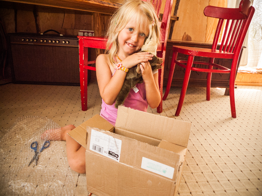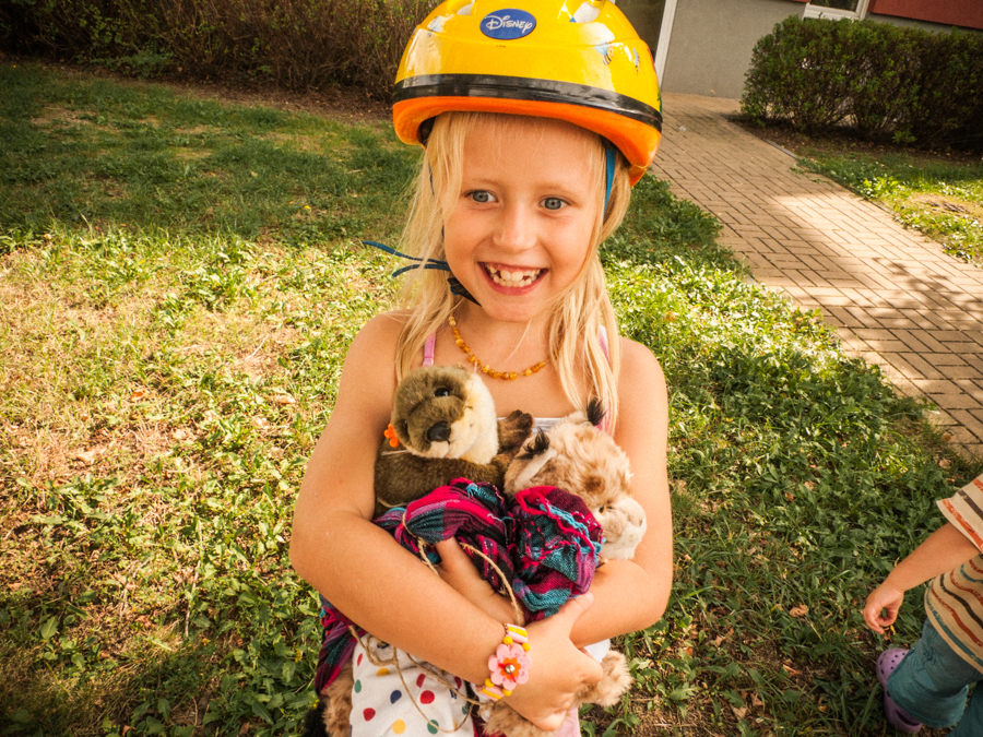 Natálka vzala hned čerstvě vybalenou vydru a kamaráda rysa na výlet. Vyrobila pro ně batoh ze šátku.