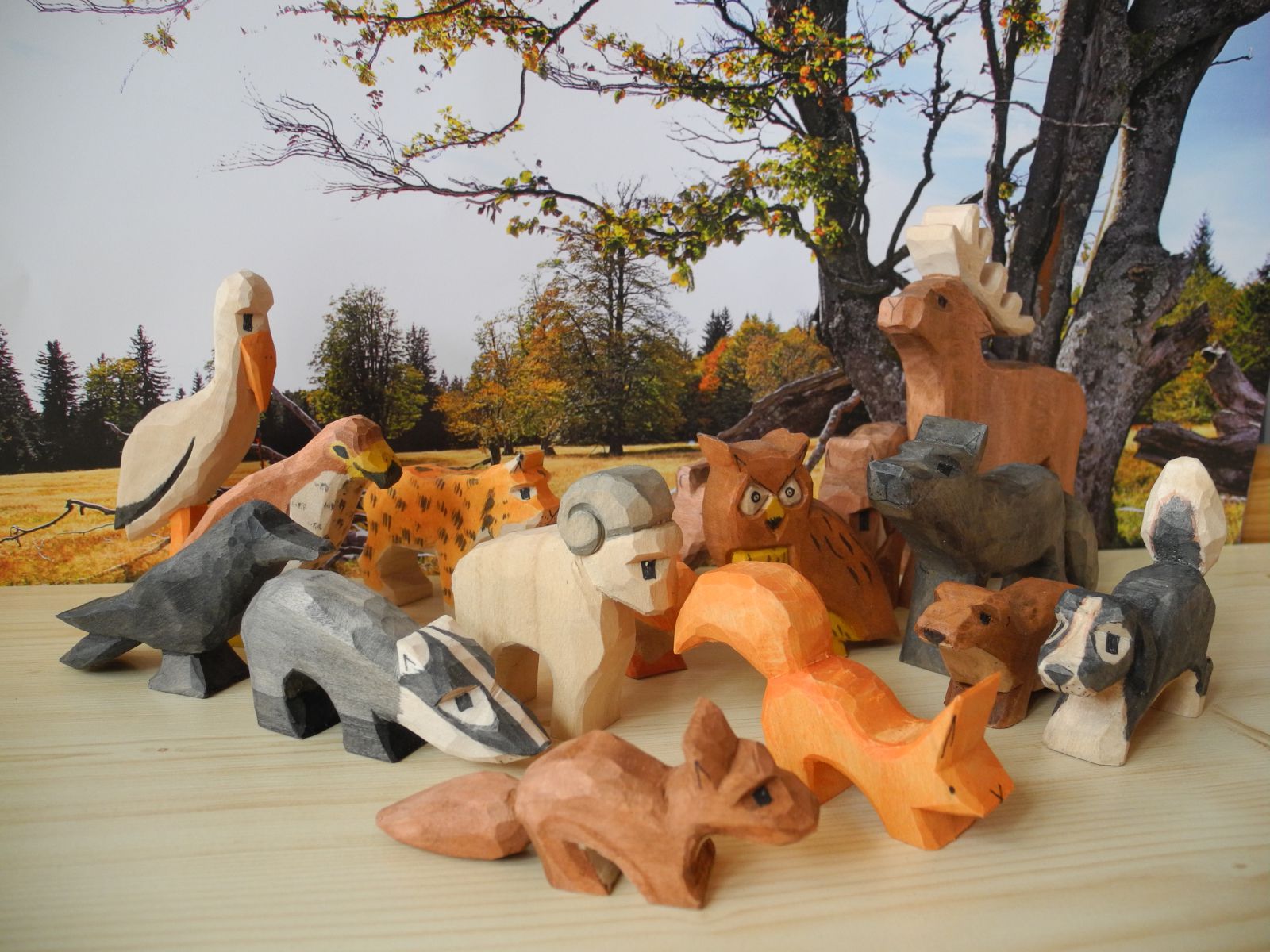 Jedná se o ručně vyřezávaná dřevěná zvířátka od Hnutí Duha. Můžete je zakoupit buď u nás v Ekoobchůdku (Pláteníkova 264, Vlašim) nebo v Domě přírody Blaníku. Naleznete zde celkem 16 druhů zvířátek – např. psa, ovečku, jelena, veverku, jezevce nebo rysa. A ceny jsou od 75 do 209 Kč.
