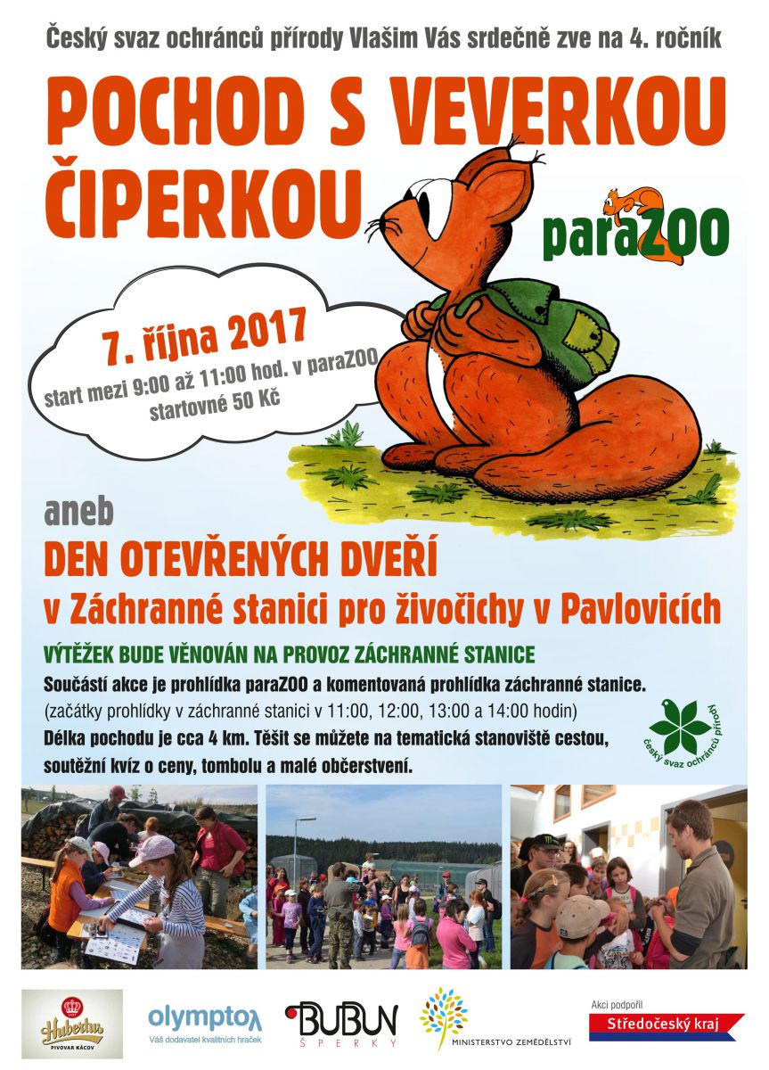 Jako každoročně pořádá i letos Podblanické ekocentrum ČSOP Vlašim Pochod s veverkou Čiperkou aneb Den otevřených dveří v záchranné stanici pro živočichy v Pavlovicích. V sobotu 7. října se účastníci vypraví pěšky z vlašimské paraZOO do záchranné stanice. Během cca čtyřkilometrového pochodu budou sbírat body na zábavných stanovištích, která navazují na témata péče a ochrany divokých zvířat z naší přírody. V cíli je pak čekají komentované prohlídky stanice, občerstvení a odměny jako trička, suvenýry paraZOO nebo třpytivé tetování.