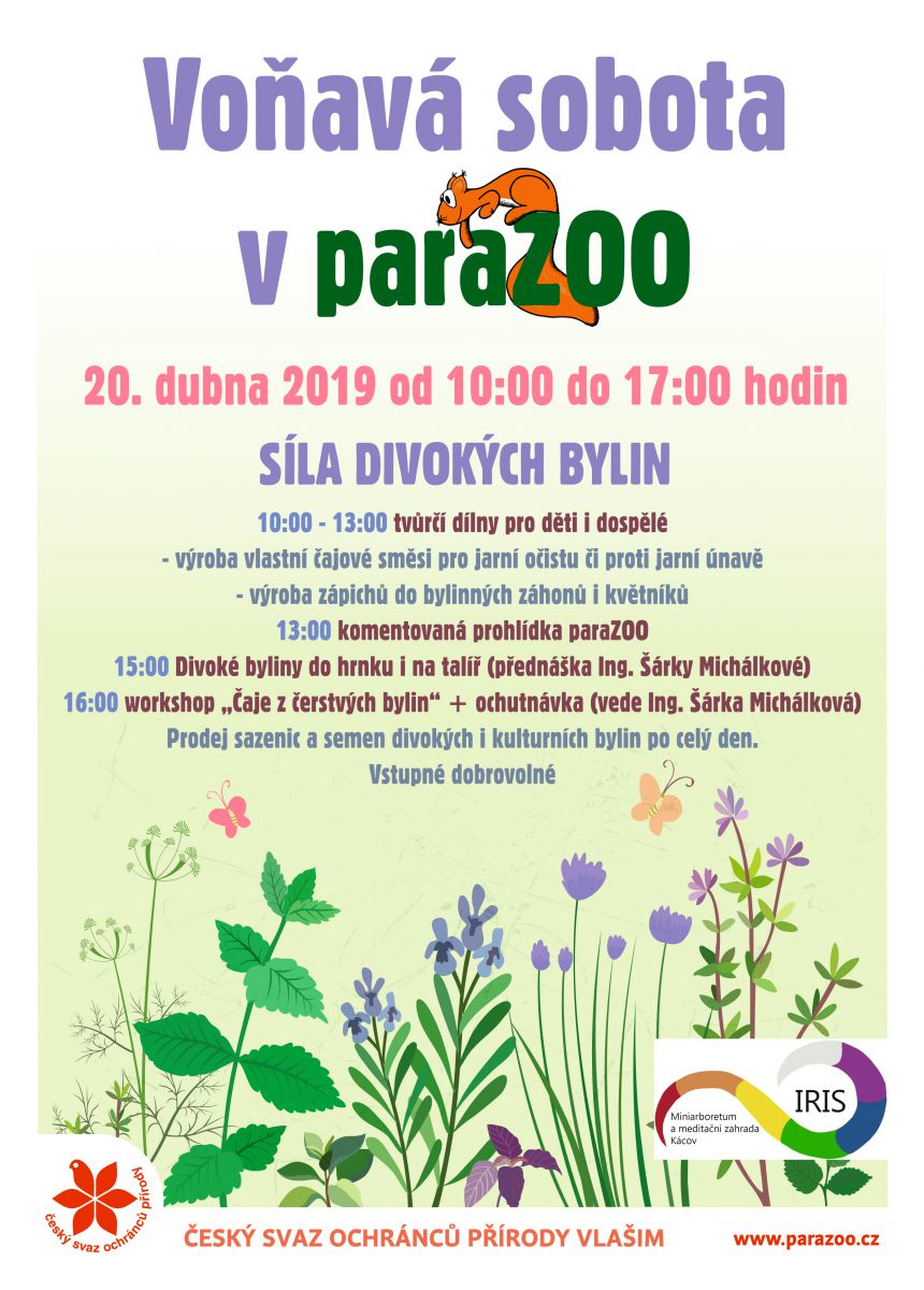 První "Voňavá sobota" v paraZOO se zaměří na sílu divokých bylin. Ing. Šárka Michálková vám poví, jak využít to, co najdete na procházce, jak si bylinky můžete vypěstovat na zahradě a jaké účinky vlastně mají. V praktickém workshopu si budete moct vyzkoušet vlastní nálevy.