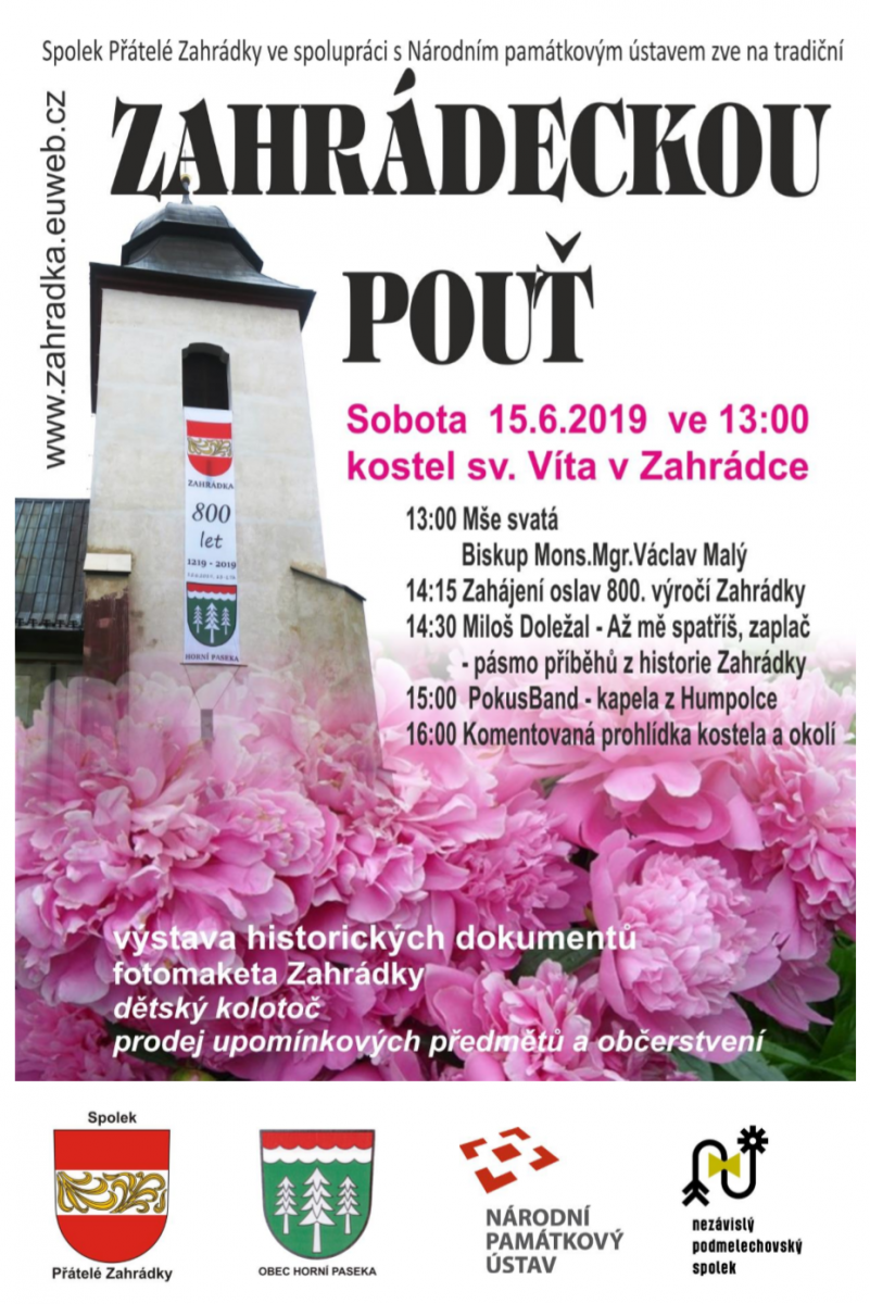 Program v kostele sv. Víta, který je poslední připomínkou vysídleného městečka, a v jeho okolí připravuje Spolek Přátelé Zahrádky ve spolupráci s obcí Horní Paseka, Národním památkovým ústavem a Nezávislým podmelechovským spolkem na sobotu 15.6 od 13 do 17 hodin.