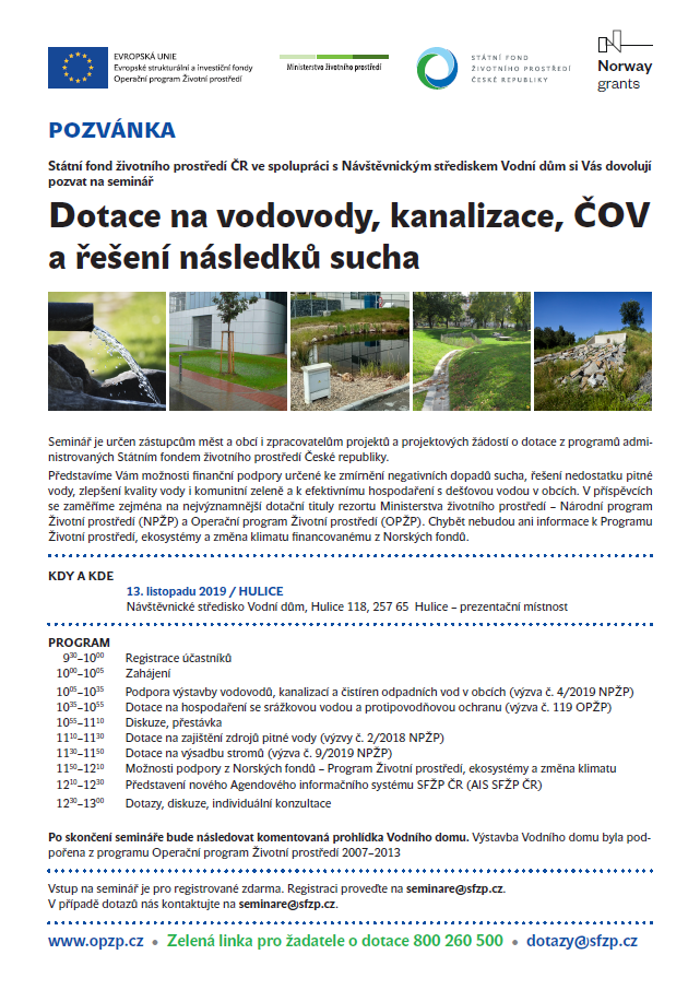 Pozvánka na seminář Dotace na vodovody, kanalizace, ČOV a řešení následků sucha