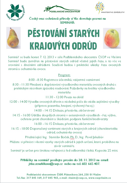 Všechny zájemce z řad laické i odborné veřejnosti zveme na seminář Pěstování starých krajových odrůd, který  se bude konat 7. 12. 2013 v Podblanickém ekocentru ve Vlašimi. Součástí bude i praktická ukázka řezu ovocných stromů a možnost určení přinesených vzorků starých odrůd. Zájemci se prosím hlaste. Více informací v příloze.